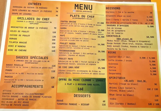 Sô Yiri est un restaurant panafricain situé au 25 Rue de Flandre, au cœur du quartier Sainte-Catherine et à quelques pas de la Bourse de Bruxelles, qui vous accueille dans un cadre chaleureux propice au partage. Cette adresse conviviale propose un véritable voyage culinaire avec des incontournables tels que le Poulet Yassa sénégalais, le Garba ivoirien ou le Poulet Mayo congolais, accompagnés de portions généreuses d'Attiéké ou de bananes plantains. L'expérience se savoure pleinement en associant ces spécialités à leur sélection de jus traditionnels rafraîchissants à base de Bissap, de tamarin ou de baobab.